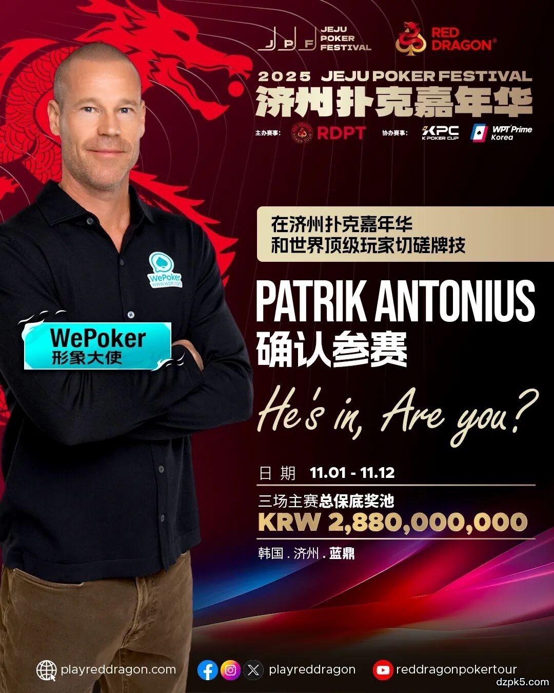 WePoker形象大使芬兰明星选手,高额传奇玩家Patrik Antonius也确认会出席本次比赛,想要和他交手拼一拼运气的扑克爱好者们千万不要错过。