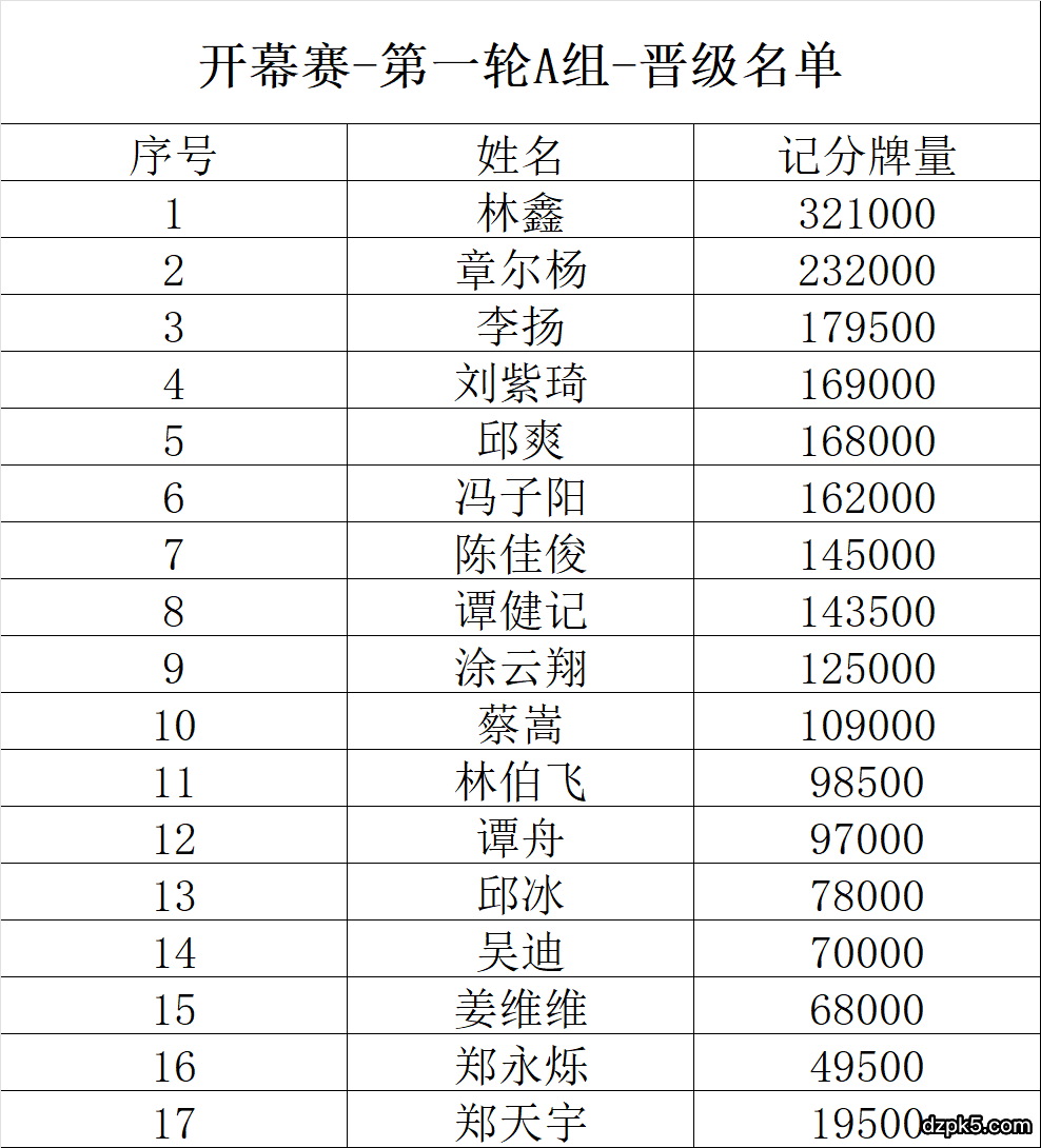 经过近八小时的角逐,德扑之星开幕赛A组112人报名,其中17人晋级Day2,来自福建的林鑫以 321,000记分牌成为A组CL。