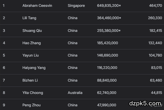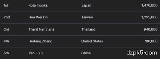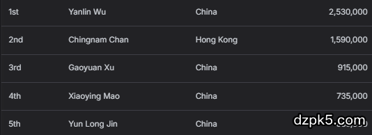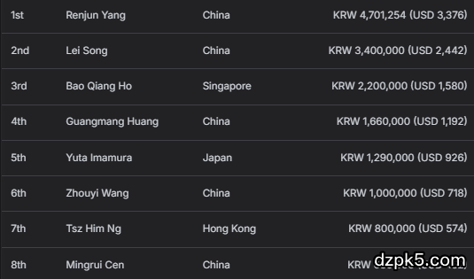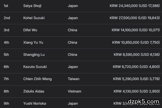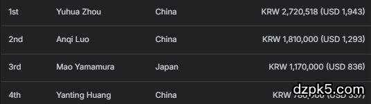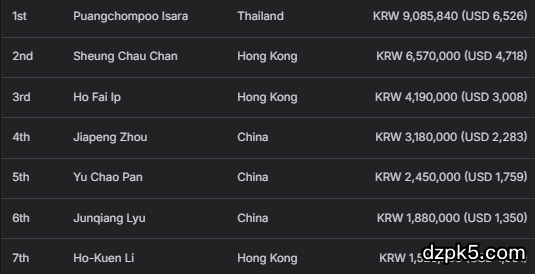 中国选手Difei Wu以14,100,000韩币(约合10,071美元)的季军成绩收官。