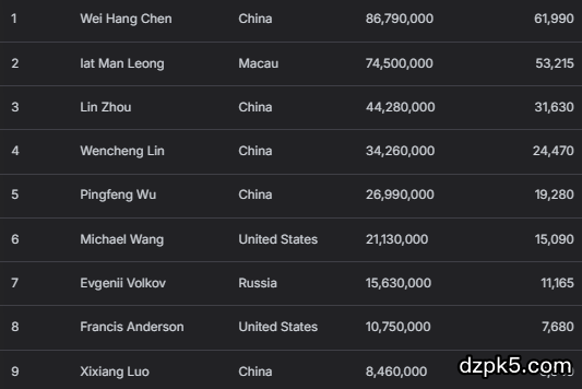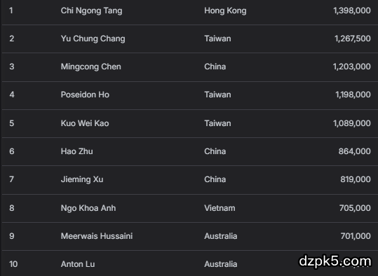 中国香港选手Chi Ngong Tang以1,398,000记分牌量领跑全场。