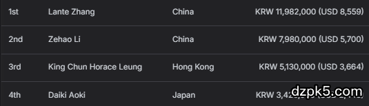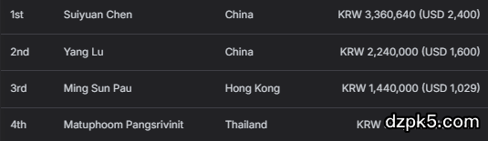 中国香港选手Tsz Yeung Ka获得亚军及1,640,000韩币(约合1,171美元)奖励;中国选手Weizheng Zhong位列季军,收获1,020,000韩币(约合729美元)。