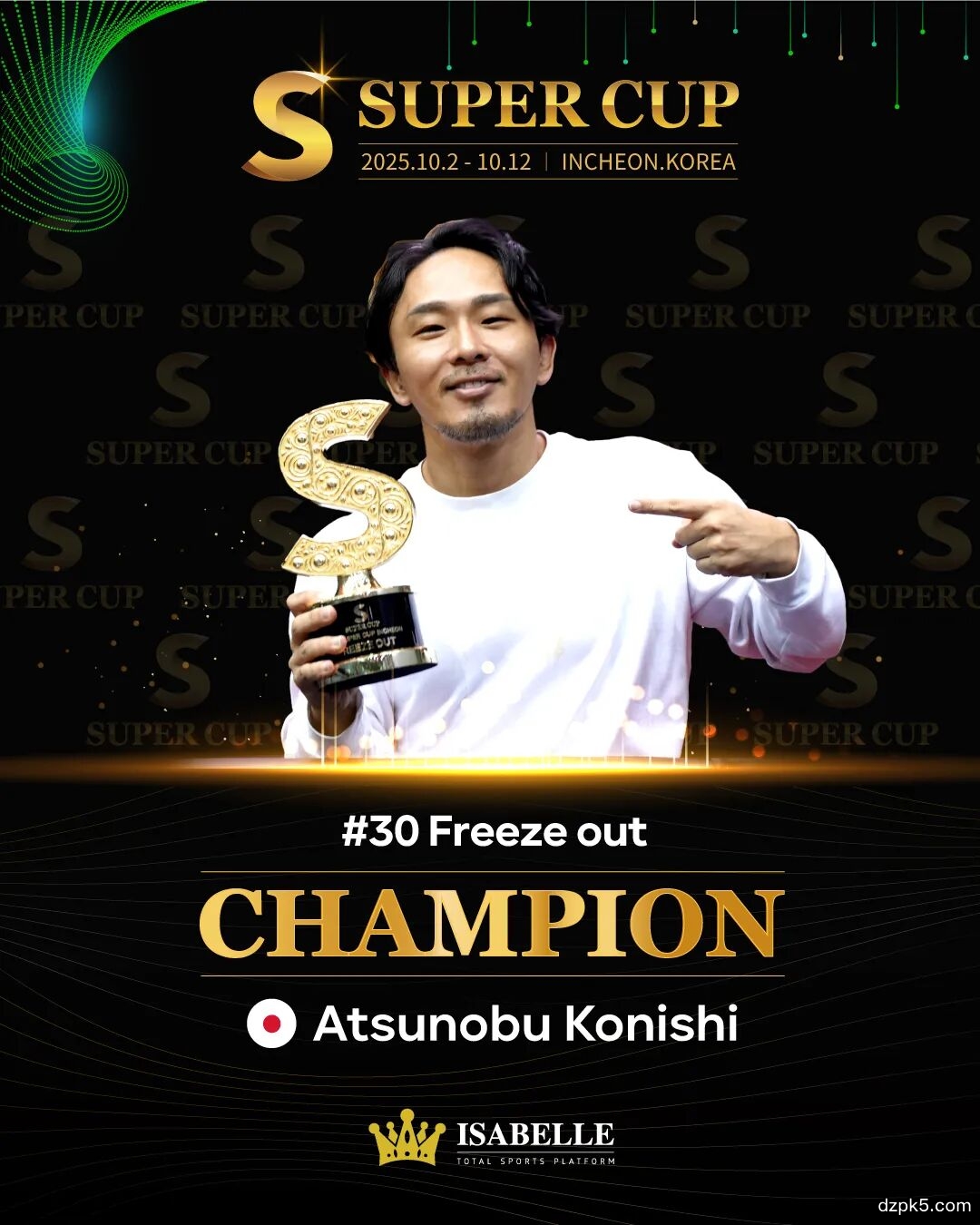 恭喜日本选手Atsunobu Konishi在#30 Freeze out赛中展现不凡实力,获得了最终冠军!