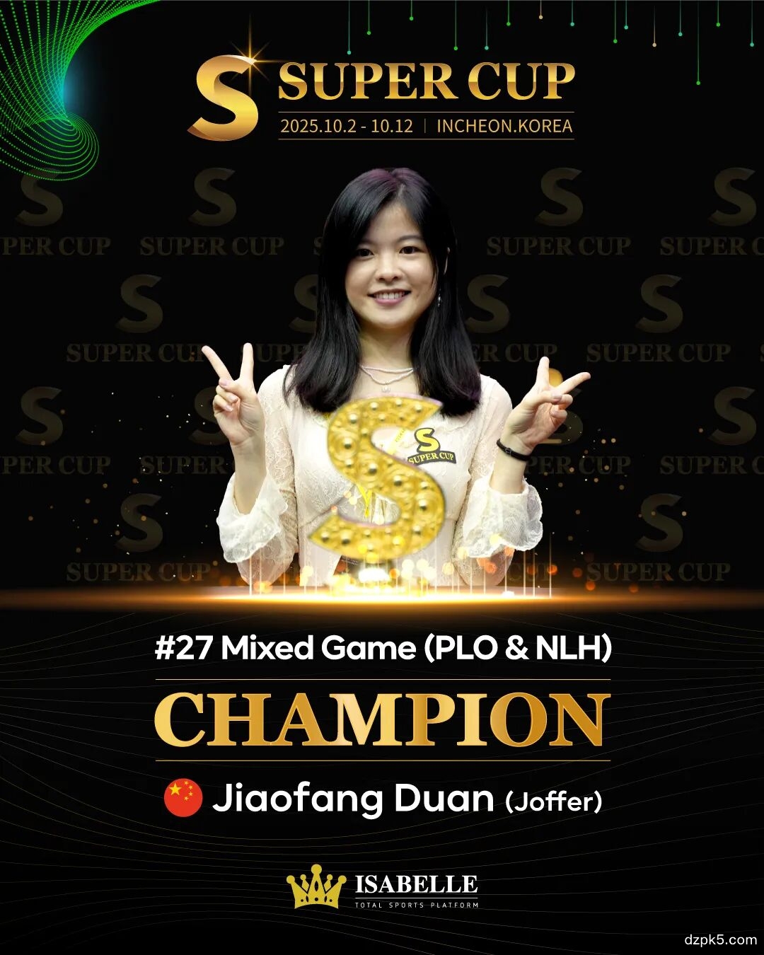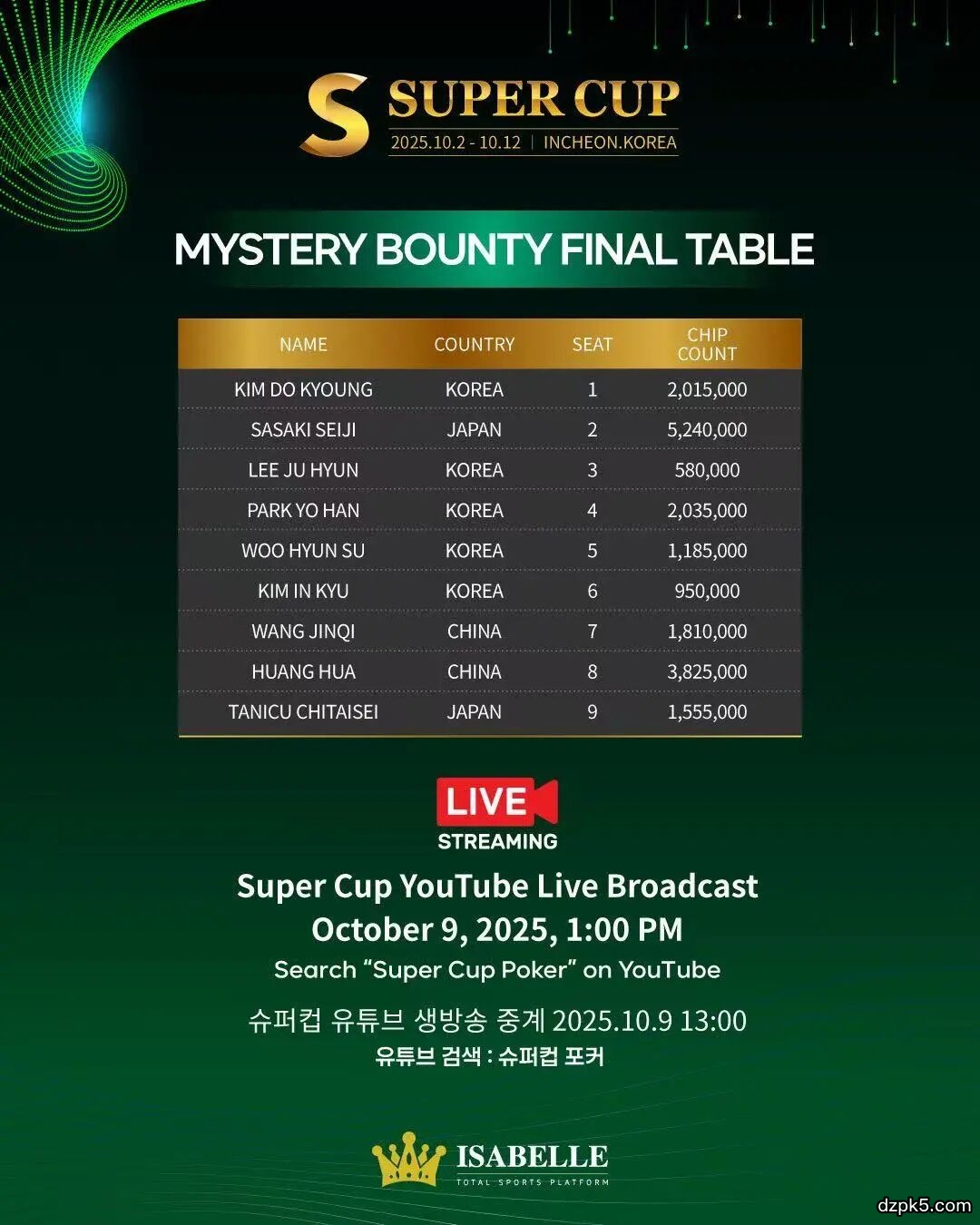 最终决赛将在10月9日12:00PM激烈开启!中国队能否再入一枚水晶奖杯?共同锁定YouTube频道"Super Cup Poker"的现场直播,为两位中国运动员加油!