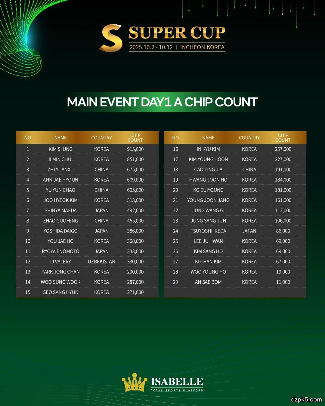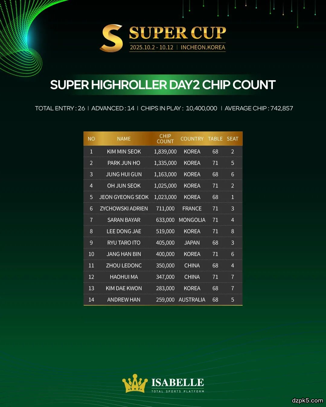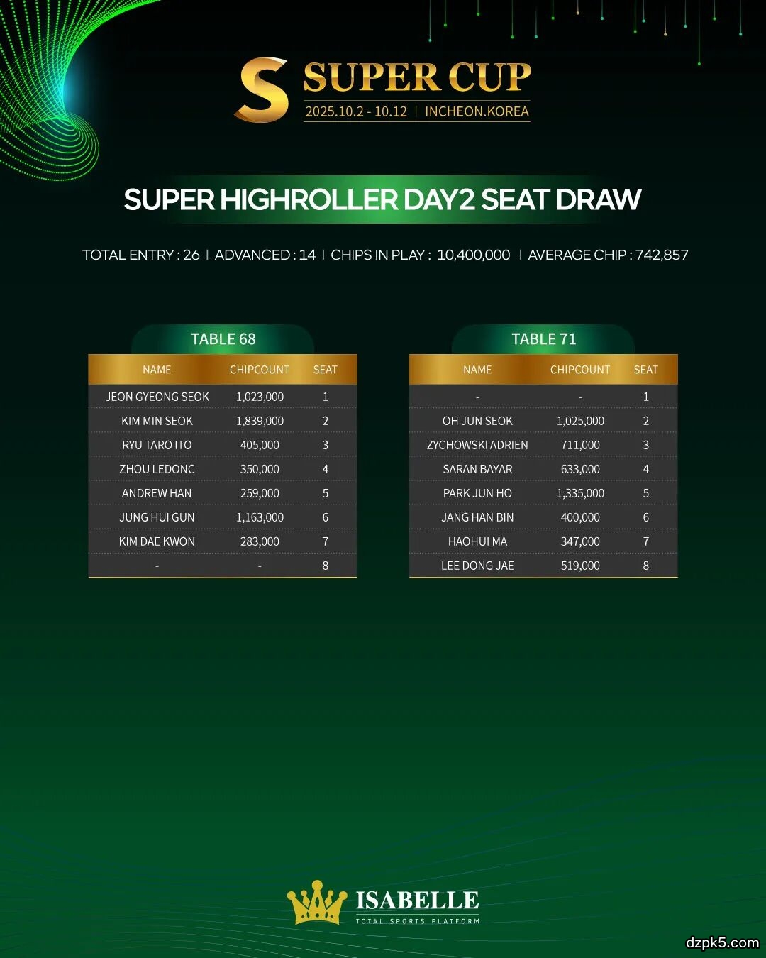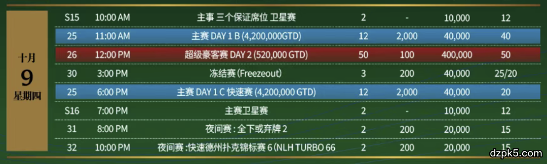 为期11天的Super Cup仁川站,目前赛事已经入第七天。今日即10月9日,#18神秘赏金赛今日DAY2决赛圈晋级争夺,本次Super Cup的主赛(保底8亿韩币)也正式开启!#26超级豪客赛DAY1进入第一阶段的晋级争夺!除此之外,还将有#27混合赛、#28 PLO快速锦标赛2以及#29 疯狂菠萝2的比拼!
