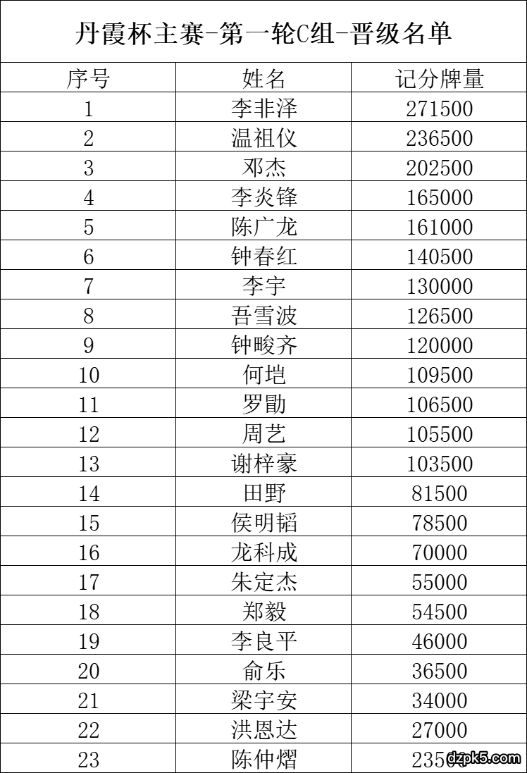 C组参赛人数:83人,晋级人数:23人,CL:李非泽 记分牌271,500;