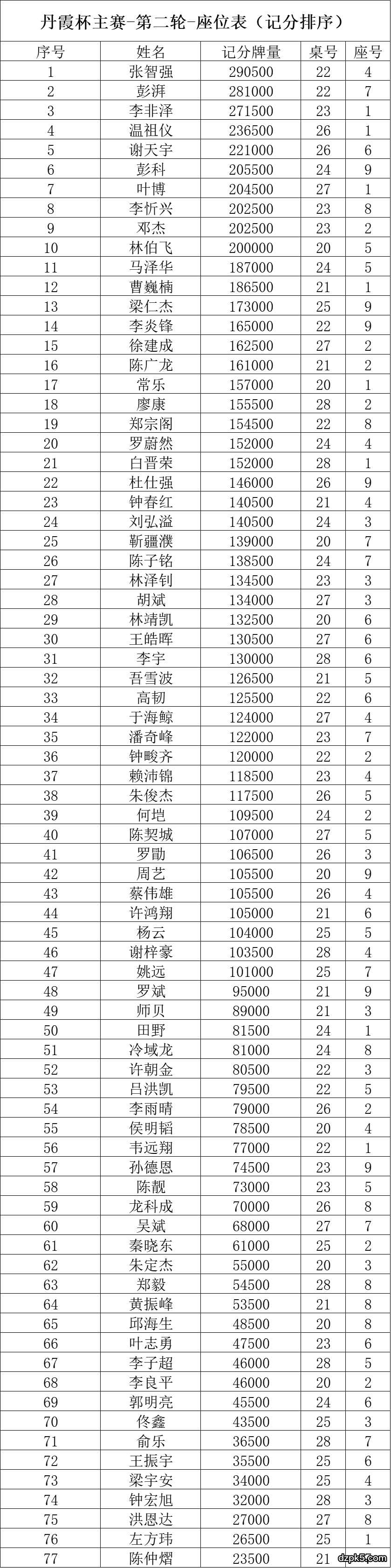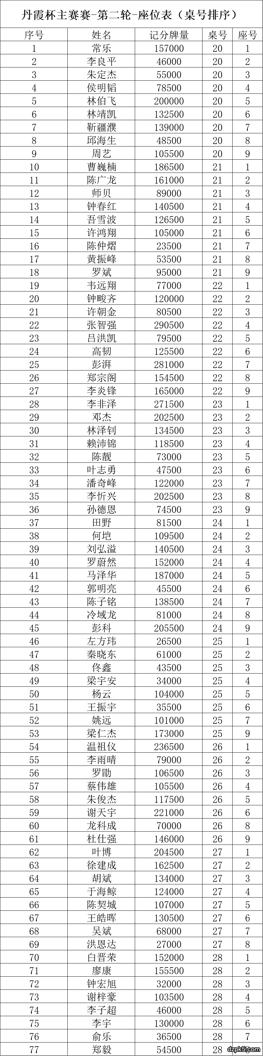 主赛事第二轮座位表