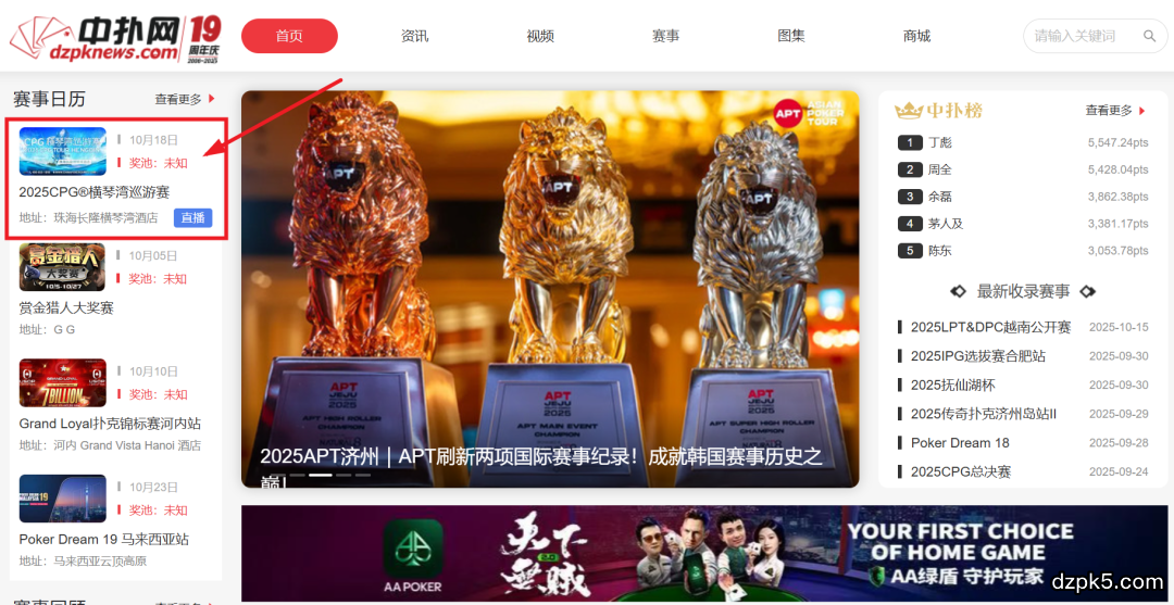 登入中扑网(www.dzpknews.com)首页,找到左上方【赛事日历】—【2025CPG横琴湾巡游赛】—【直播】