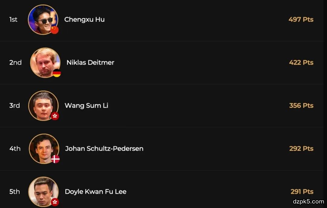在赛事被迫进入第三个比赛日时,胡成旭的记分牌一度接近垫底,但他在关键时刻抓住机会,淘汰了决赛桌上最活跃的两位玩家,最终拿下冠军。