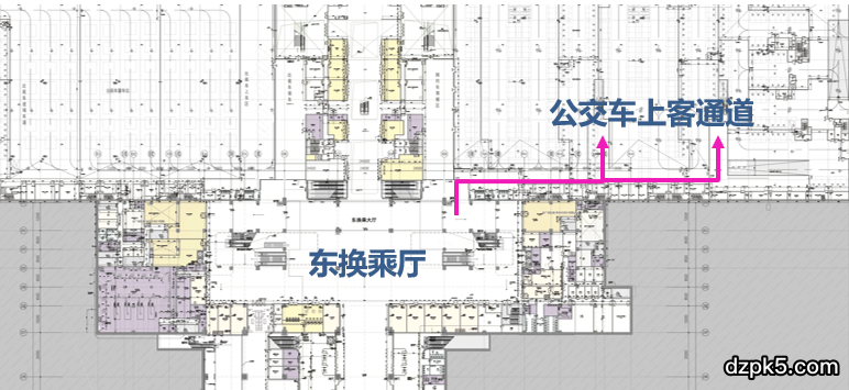出站旅客到达东换乘大厅后,通过东换乘厅右侧(南)入口,进入公交车上客通道,后经楼扶梯上至B1层公交候车岛内。