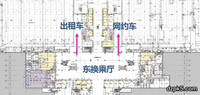 换乘网约车流线:网约车为同层换乘(B2层)。出站旅客到达东换乘大厅后,通过东换乘厅右侧(南)入口,进入网约车等候区。
