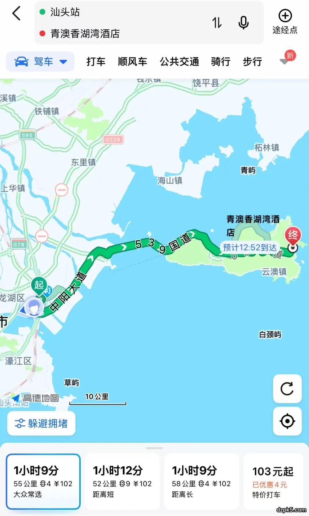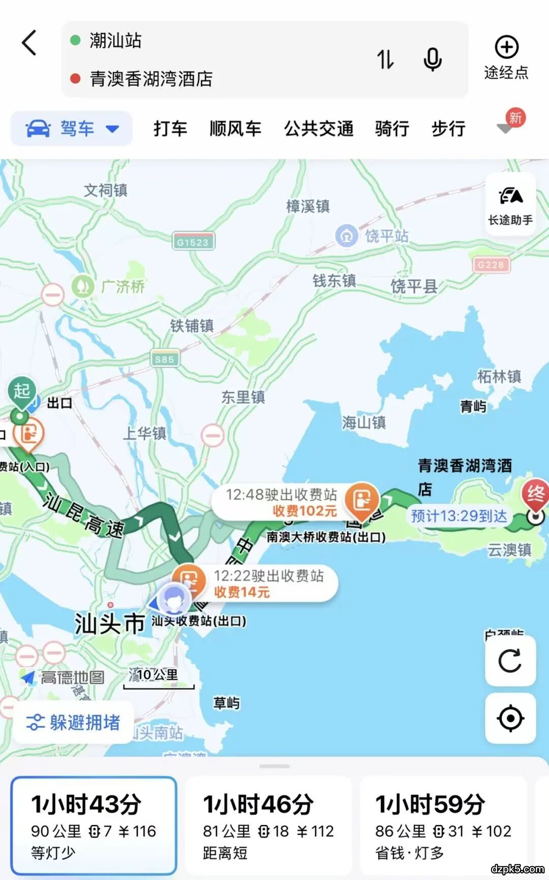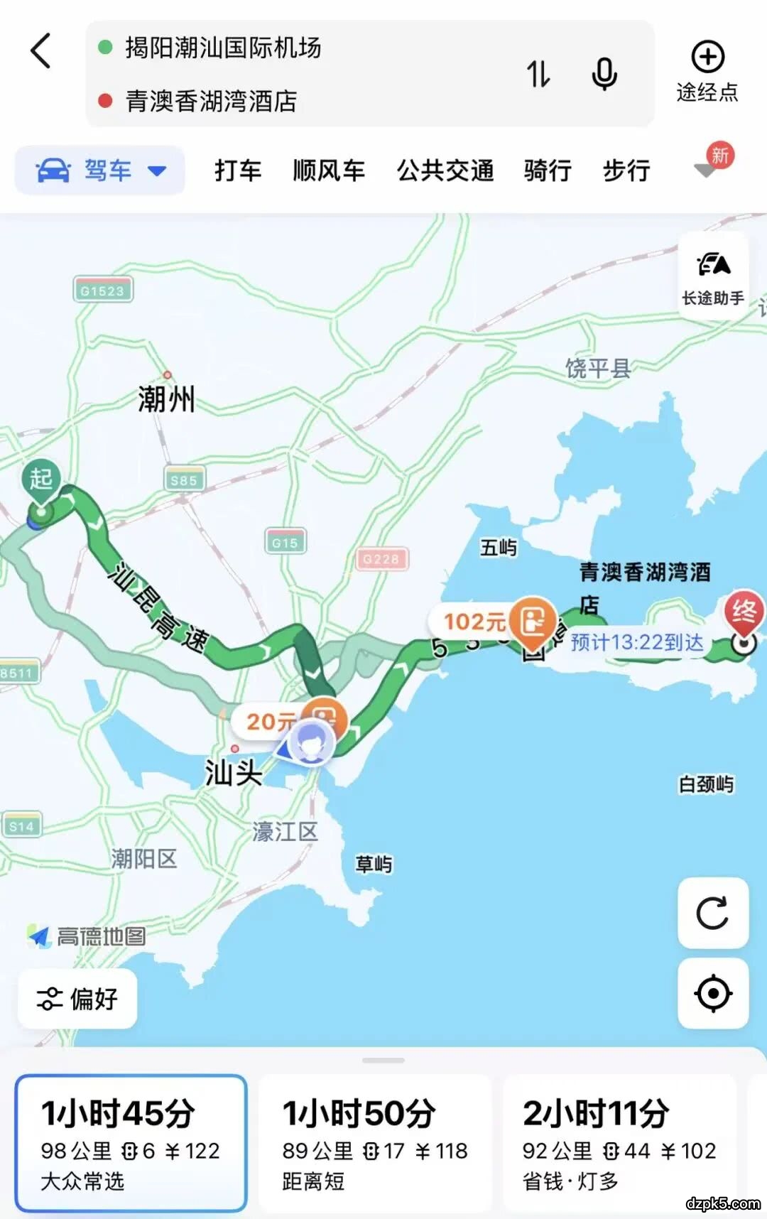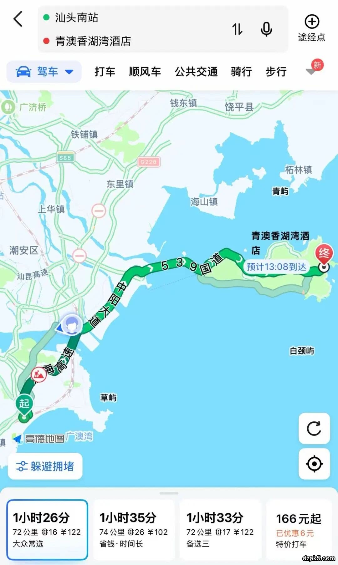汕头站-赛事酒店:打车约55.5公里,车程约1小时12分钟,车费约108元