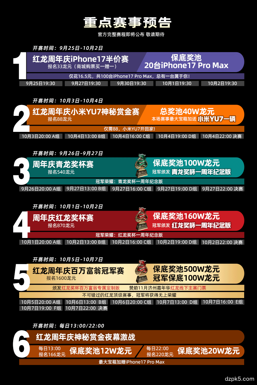 官方完整赛程即将发布,但热度已提前拉满。红龙一周年,不只是庆典,更是一次和兄弟们共同追逐荣耀、豪礼和梦想的机会。