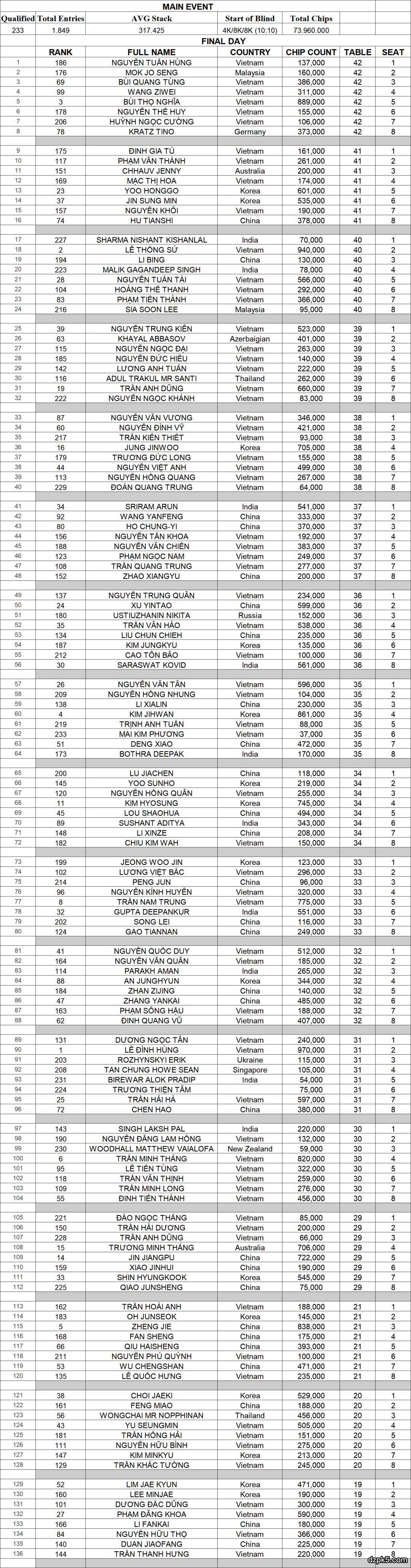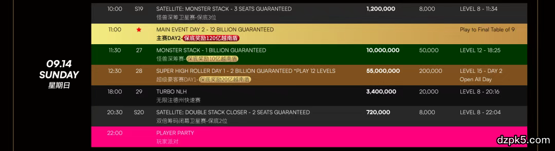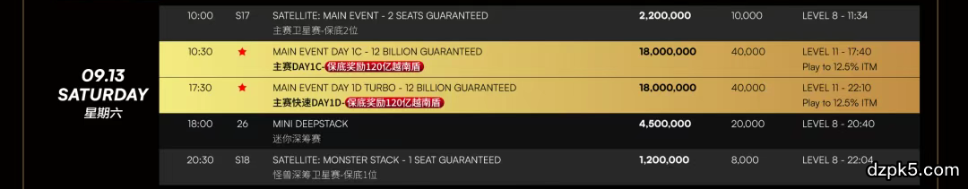 主赛DAY2将于9月14日11:00开始,其中越南选手LÊ ĐÌNH HÙNG以97万记分牌成为DAY1的Chips Leader杀出重围!国人有48人成功晋级DAY2!主赛DAY2会碰撞出什么样的火花呢,咱们拭目以待