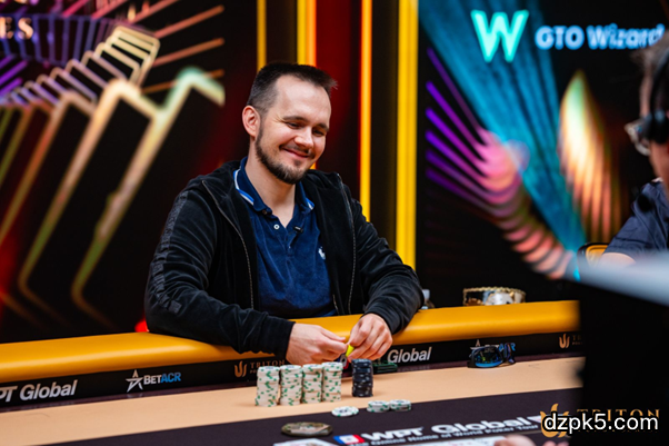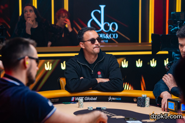 Filatov在决赛桌上此前一直相对沉寂,但突然迎来一波猛攻。他先是凭借A♣8♥翻倍击败Wang的A♠6♣,削掉部分记分牌;随后又在一手对局中用A♦K♠赢下Jiang的A♣J♠,拿下更大的底池。