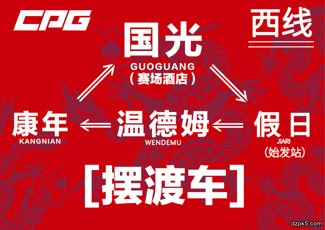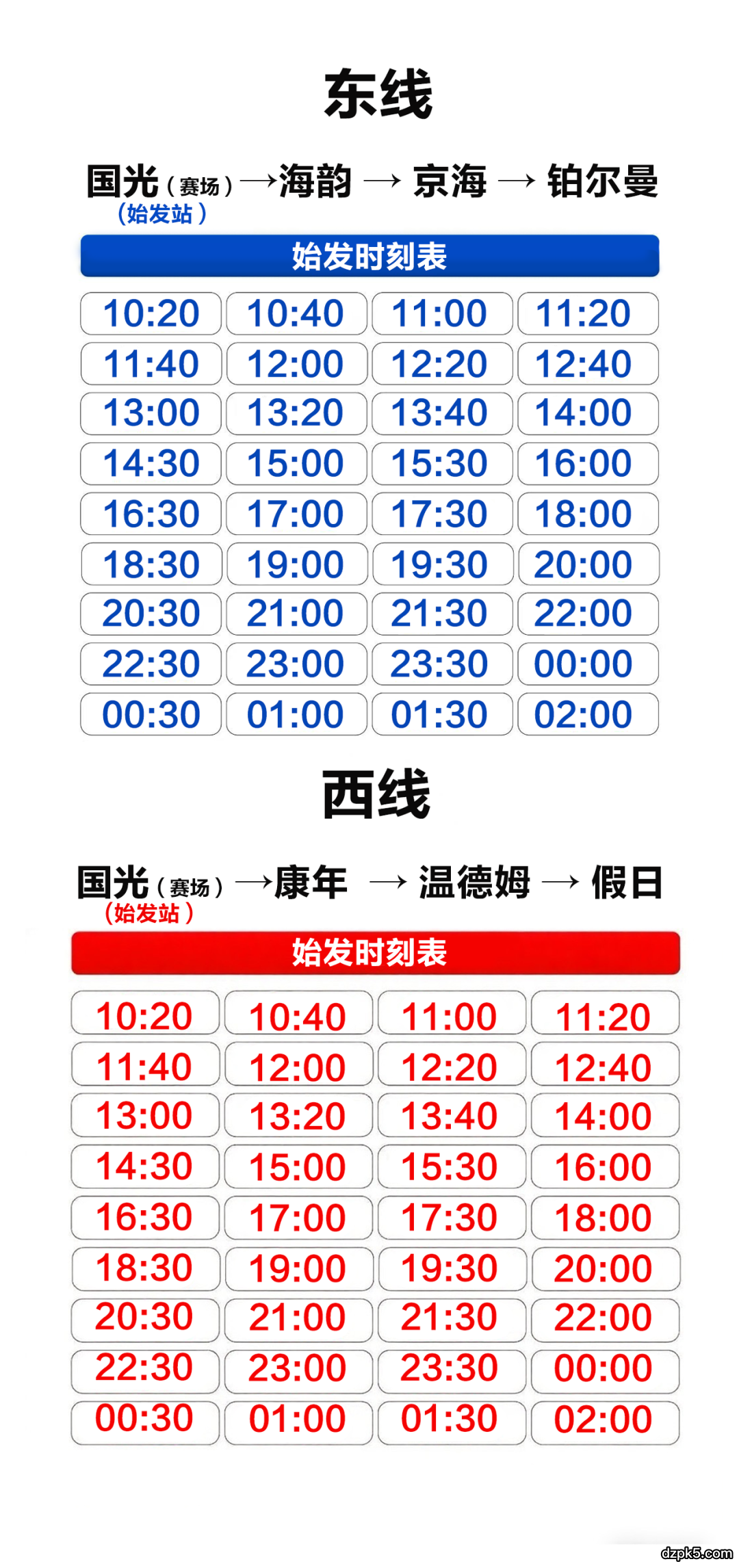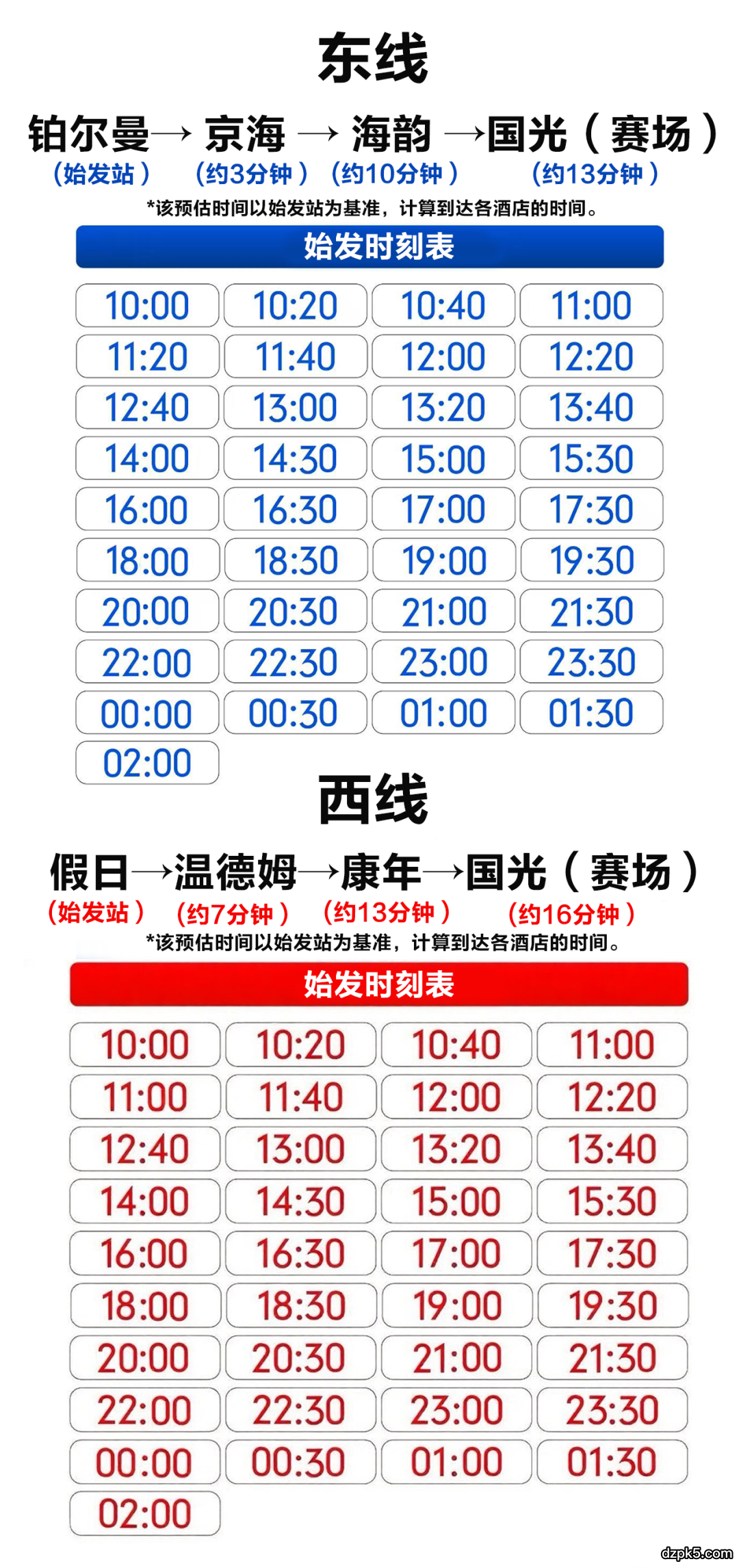 运动员可根据所入住的酒店选择乘坐东线(蓝色车标)或西线(红色车标)摆渡车往返赛场。