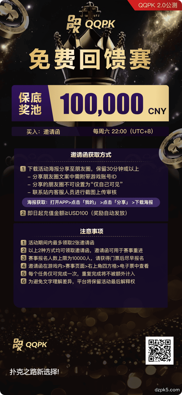 QQPK每周六晚免费回馈赛这周也将如期而至,单场GTD高达1,000,000,快来领取门票锁定席位!