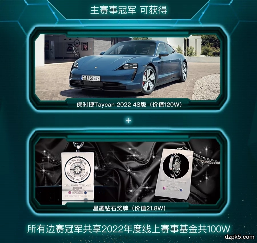 主赛冠军可以获得价值120w的保时捷Taycan跑车一台以及价值21.8w的星耀钻石奖牌一块!