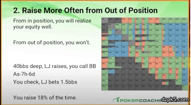 然而,如果在相同的情况下我们出于有利位置(我们是加注者,对手过牌后我们再行动),那么我们加注的频率会下降到8%。