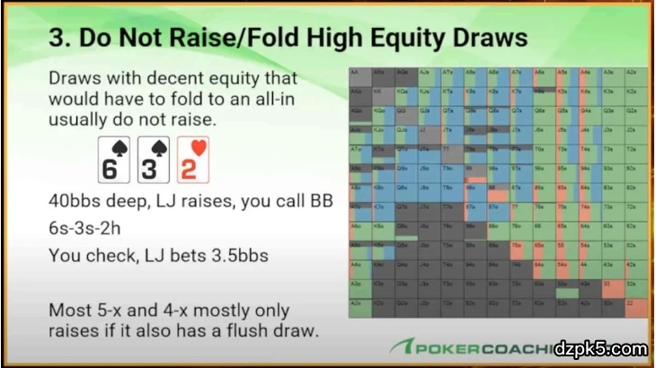 高权益的听牌(当前手牌有较高概率在后续公共牌发出后形成强牌)不适合加注,最好的策略是跟注,以尝试实现你的权益。