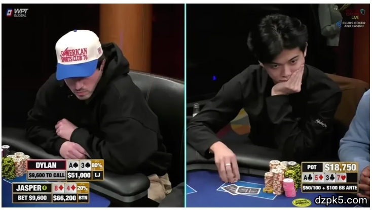 其他人都弃牌了,Dylan现在可以跟注或再次加注。两种玩法各有优缺点,但考虑到牌面结构,Jasper更有可能拿到某种听牌,而不是一手强牌。