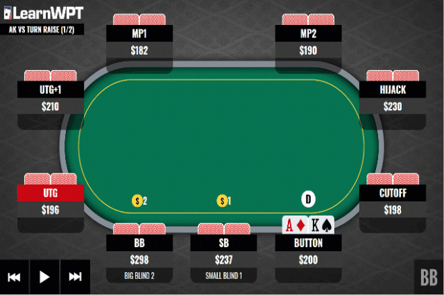 虽说如此,但实际上在盲注级别1/2的现场局中,很多对手在转牌圈加注特别紧,这意味着如果对手没有拿到一手打败能我们的牌,极少会采用这种玩法。因此尽管按照GTO策略我们此时通常不应该弃牌,但考虑到在现实中这个级别牌局的普遍趋势,事实上放弃这手牌往往是可行的玩法。